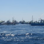 みんなでマグロの群れを追いかける為すごい船の数です。良くぶつからないと船長達の操船技術に関心です。